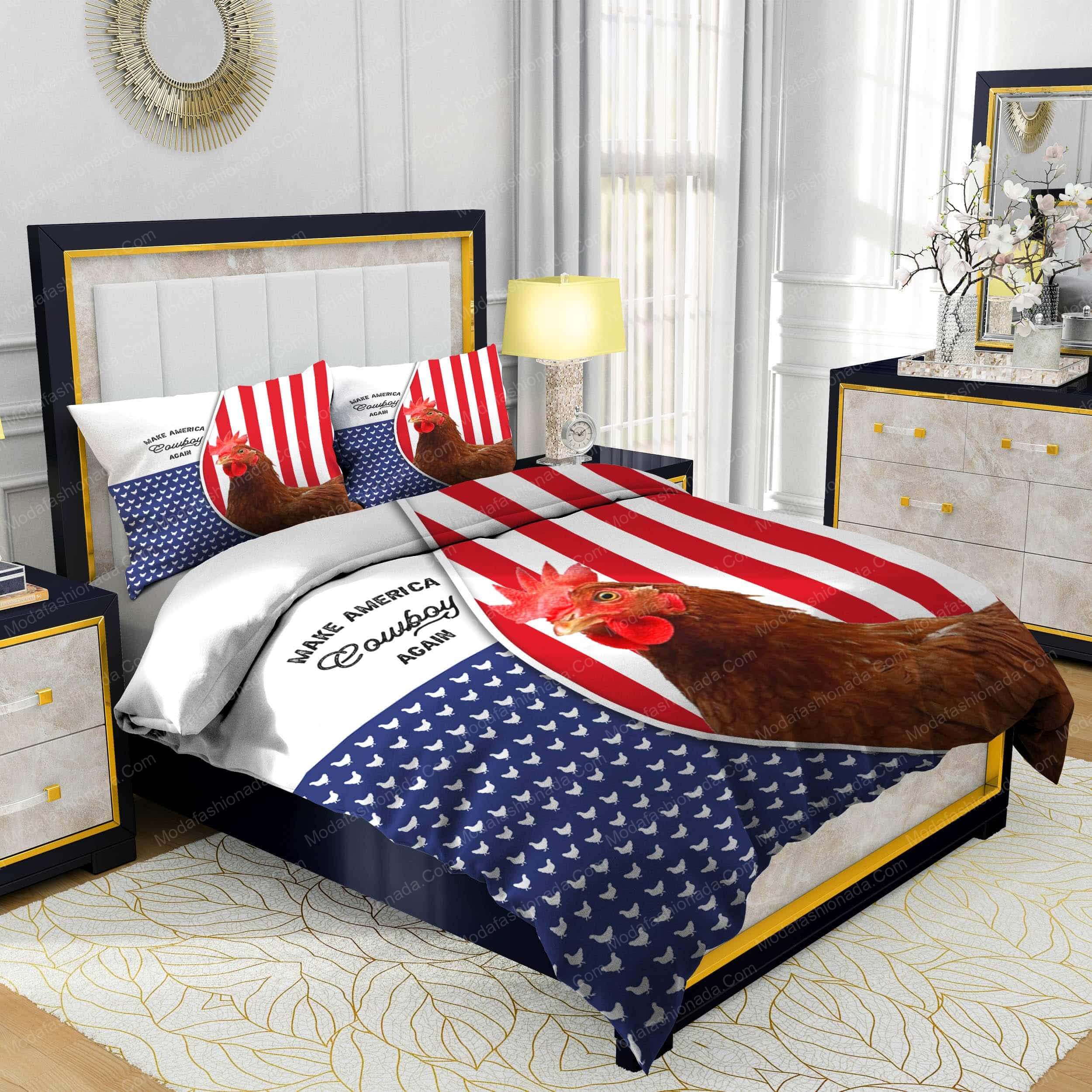 1. Description 2. SIZE CHART 3. PRINTS: Dye-sublimation printing 4. WASHABLE: Machine washable, soft mode. Machine wash cold, only non-chlorine bleach when needed, hang dry, cool iron on the reverse side or dry clean 5. PRODUCTION TIME: 3-5 Business Days. 6.SHIPPING : You will receive an email once your order ships that contain your tracking information. If you haven’t received tracking info within 3-5 business days, please contact us.Soothing bedsheets Independence Day Chicken Rooster Make America Cowboy Again With American Flag Bedding Sets make a great refreshing night's sleep.
