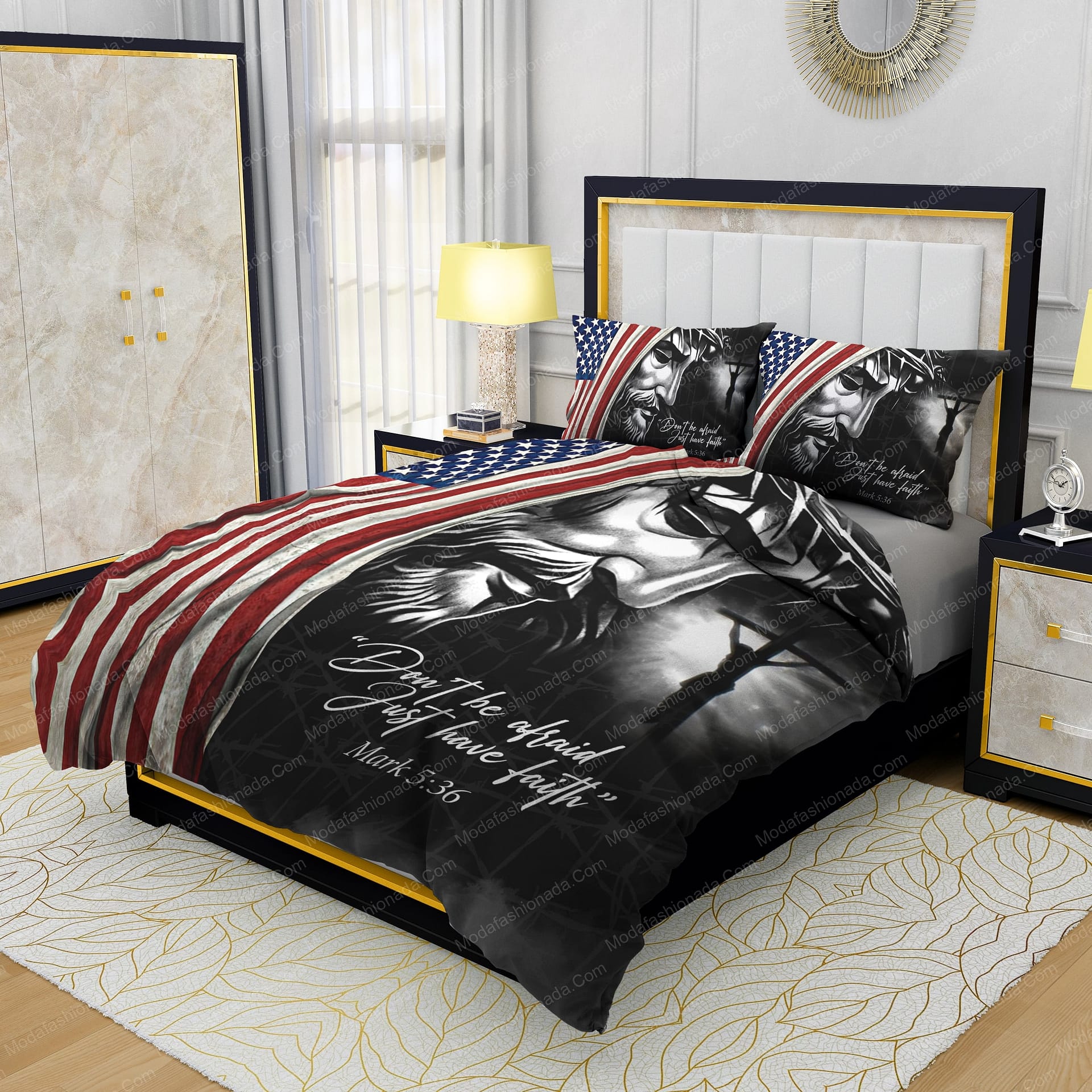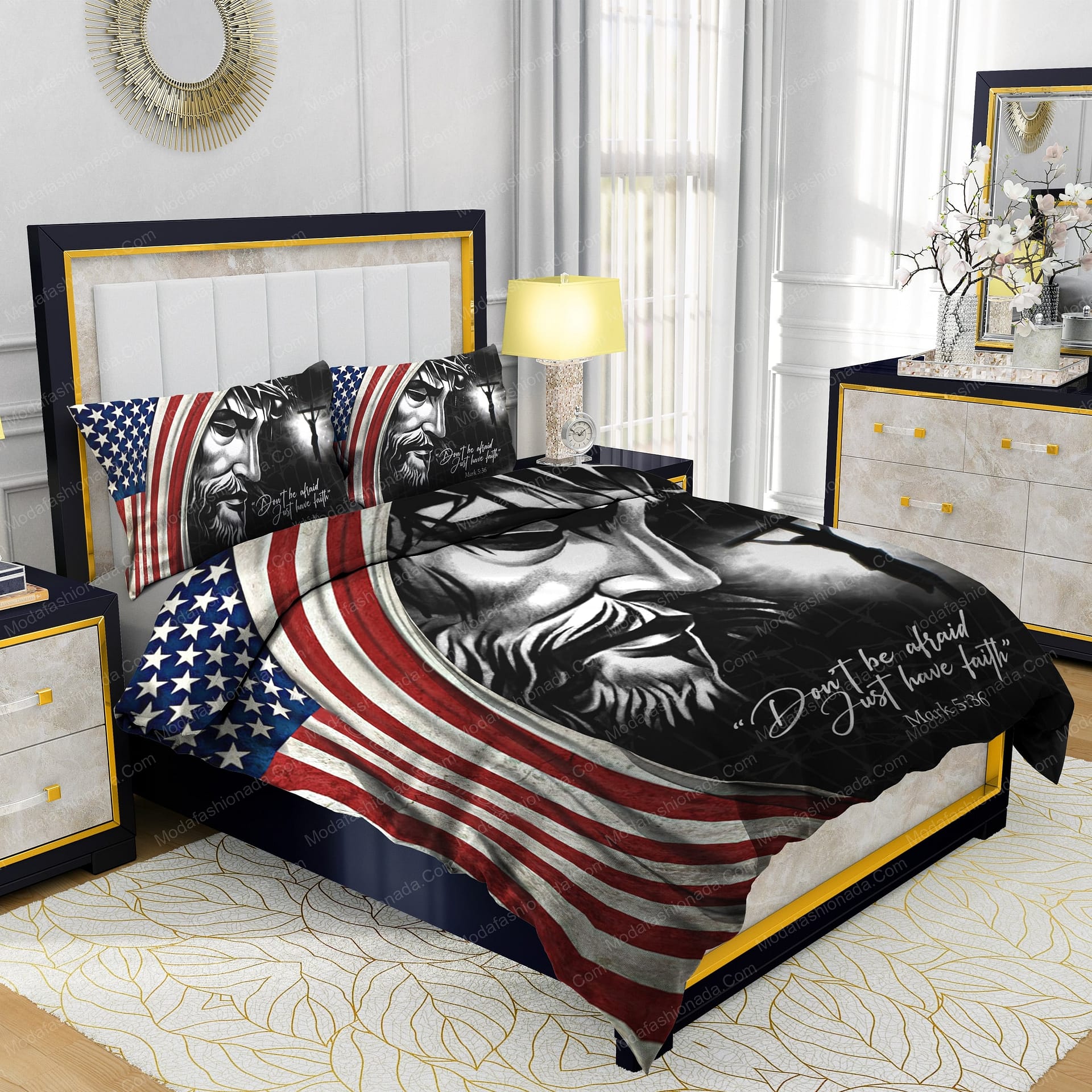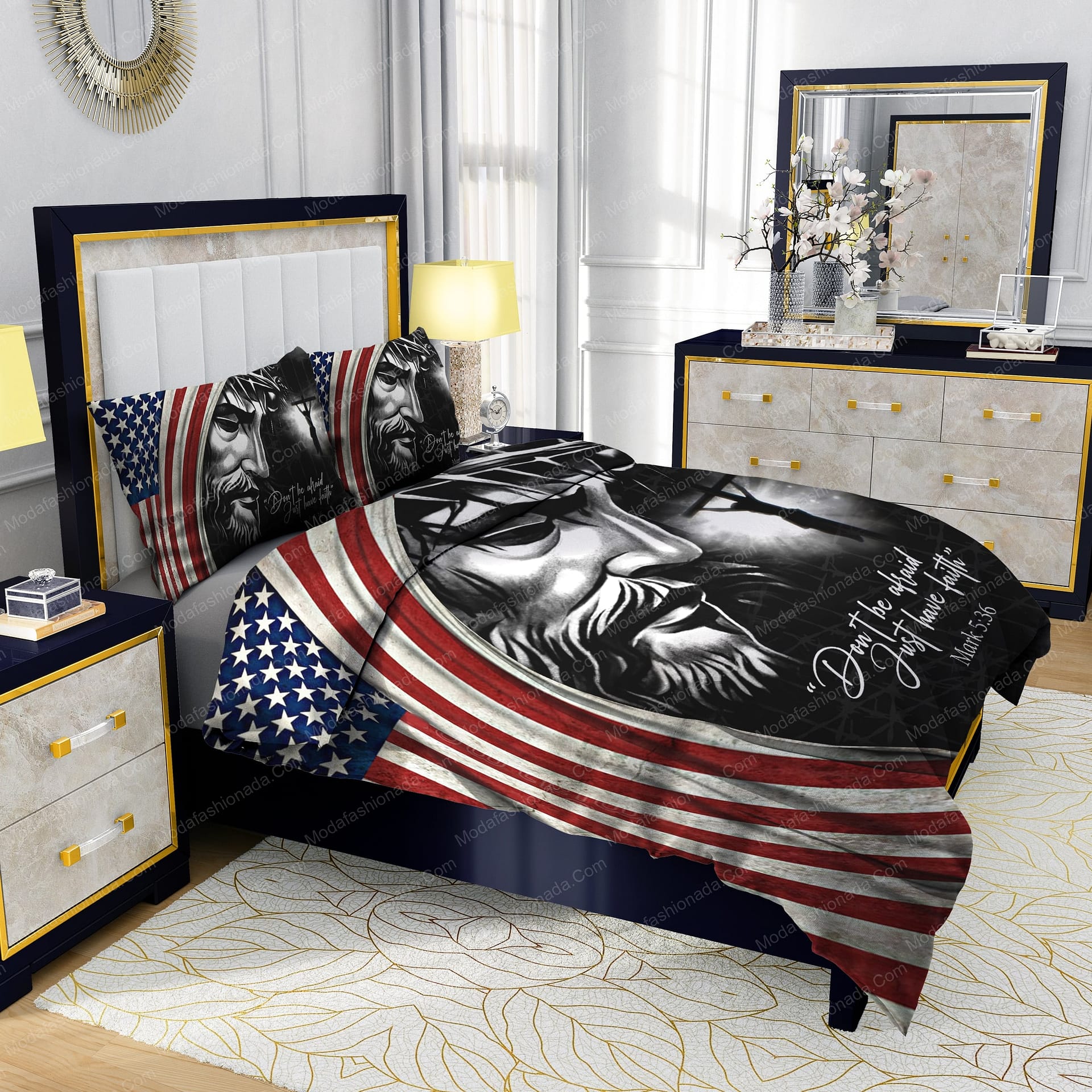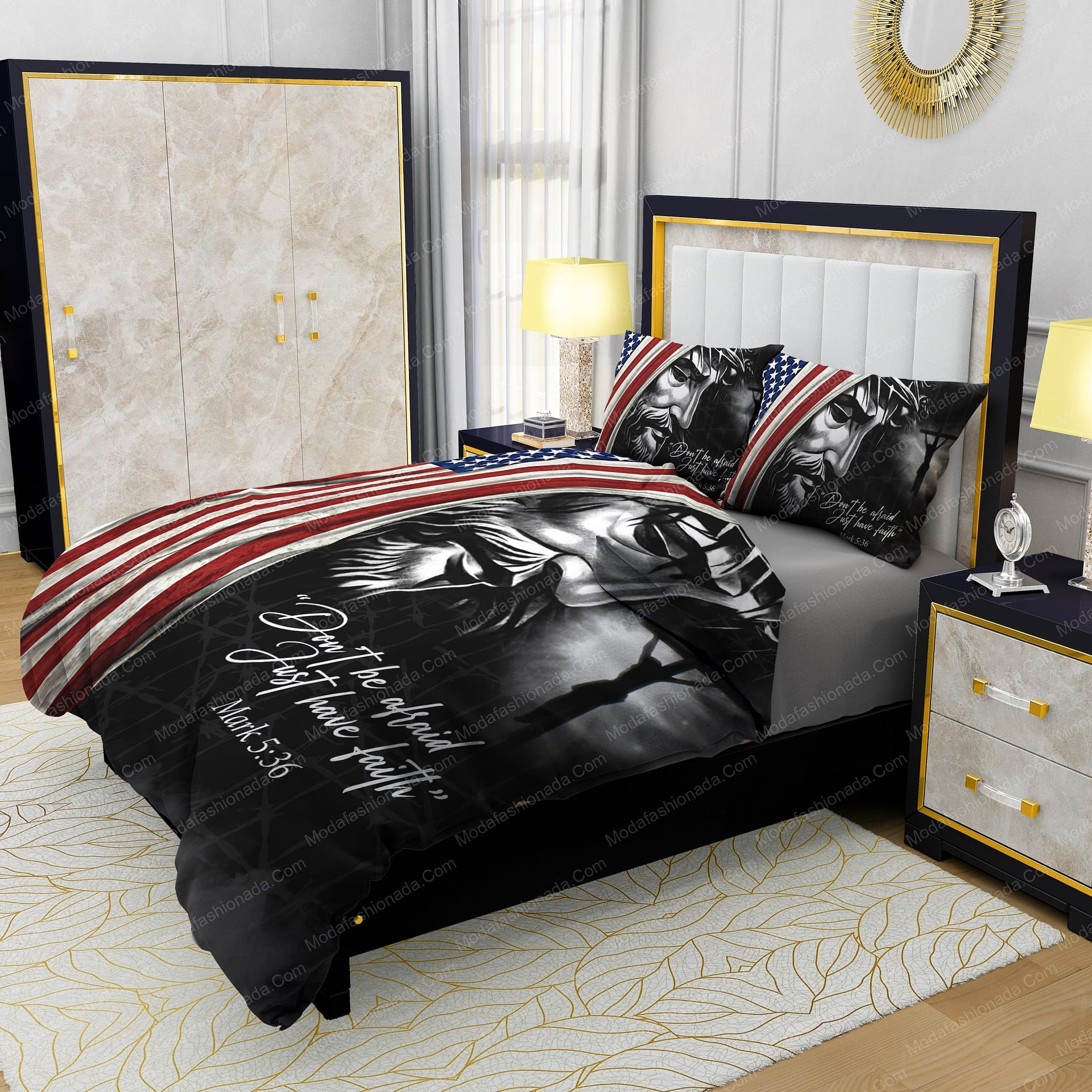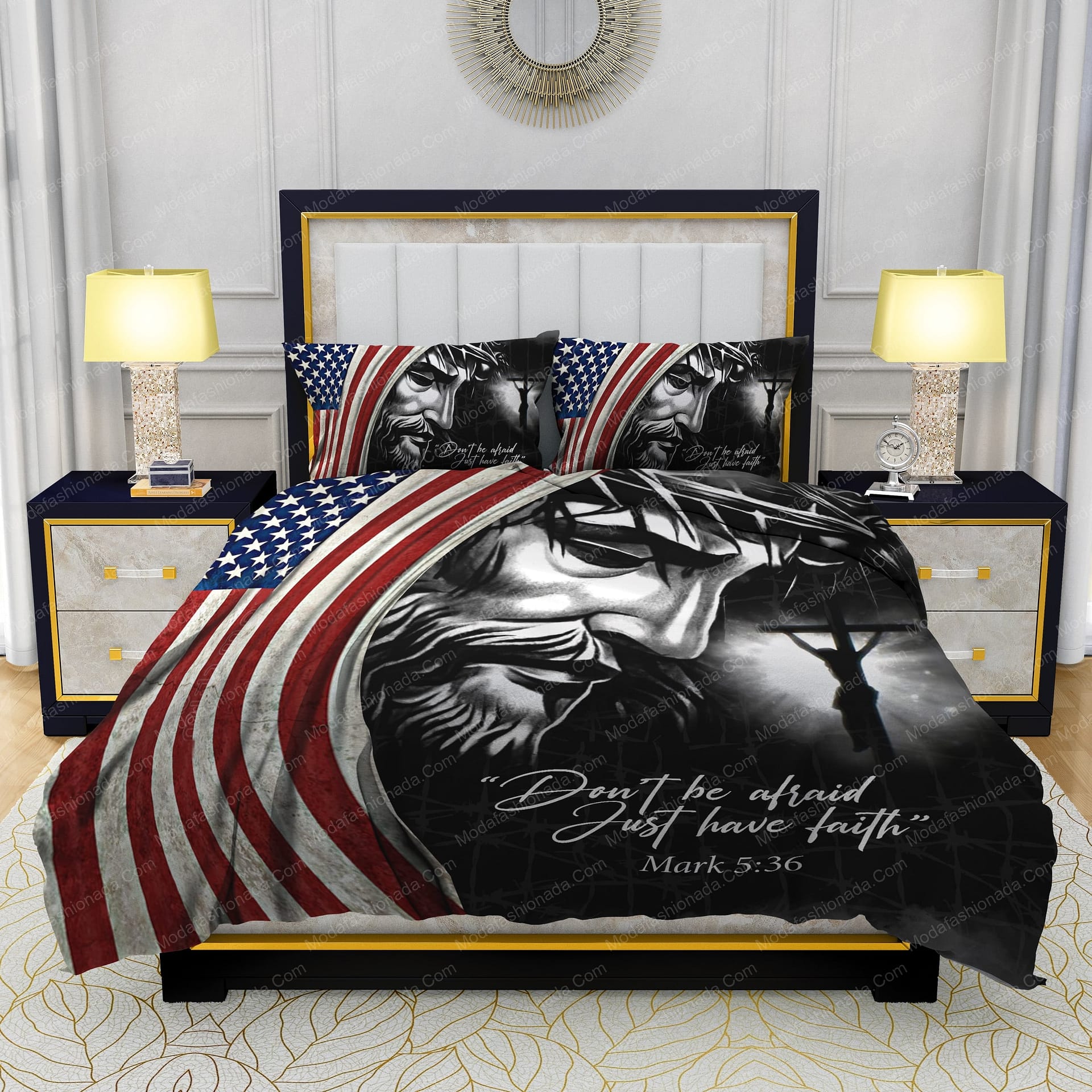 1. Description 2. SIZE CHART 3. PRINTS: Dye-sublimation printing 4. WASHABLE: Machine washable, soft mode. Machine wash cold, only non-chlorine bleach when needed, hang dry, cool iron on the reverse side or dry clean 5. PRODUCTION TIME: 3-5 Business Days. 6.SHIPPING : You will receive an email once your order ships that contain your tracking information. If you haven’t received tracking info within 3-5 business days, please contact us.Soothing bedsheets Jesus Don't The Afraid Just Have Faith Bedding Sets make a great refreshing night's sleep.